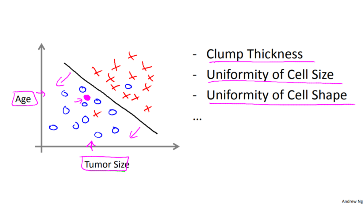 실제로는 Age, Clump Thickness, Uniformity of Cell Size, Uniformity of Cell Shape 등, 수만가지 특징(feature)을 가지고 분석할 것이다.