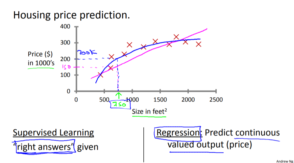 X 모양이 실제 데이터라고 할 때 우리는 데이터의 회귀모형을 이용해서 주어진 데이터의 정보가 아닌 새로운 데이터를 예측할 수 있다. 예로들어 "집 크기가 750일때 가격은 어떠할 것인가?" 를 예측 해볼 수 있다.