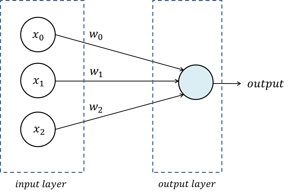가장 단순한 형태의 신경망을 퍼셉트론이라고 부른다. 입력층(input layer) 하나와 출력 노드 하나로 구성된다.