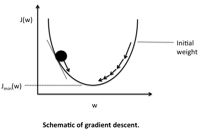 Gradient descent는 경사 하강법으로 비용함수(cost function) J(w)의 w에 대한 미분값을 이용해서 update를 해나간다.