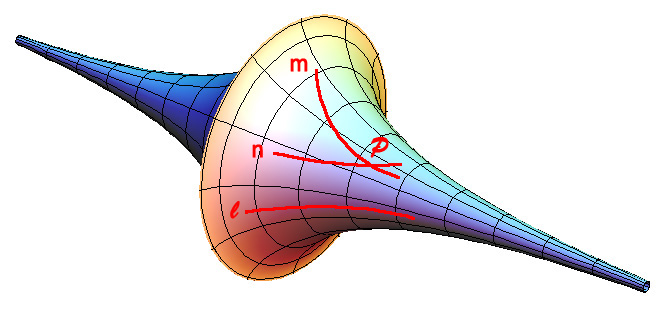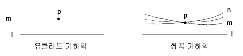 위의 그림에서 보이듯이, 유클리드 기하학에서는 하나의 직선밖에 존재하지 않지만(평행성 공증) 위의 쌍곡 기하학에서는 다양한 직선이 존재할 수 있다.