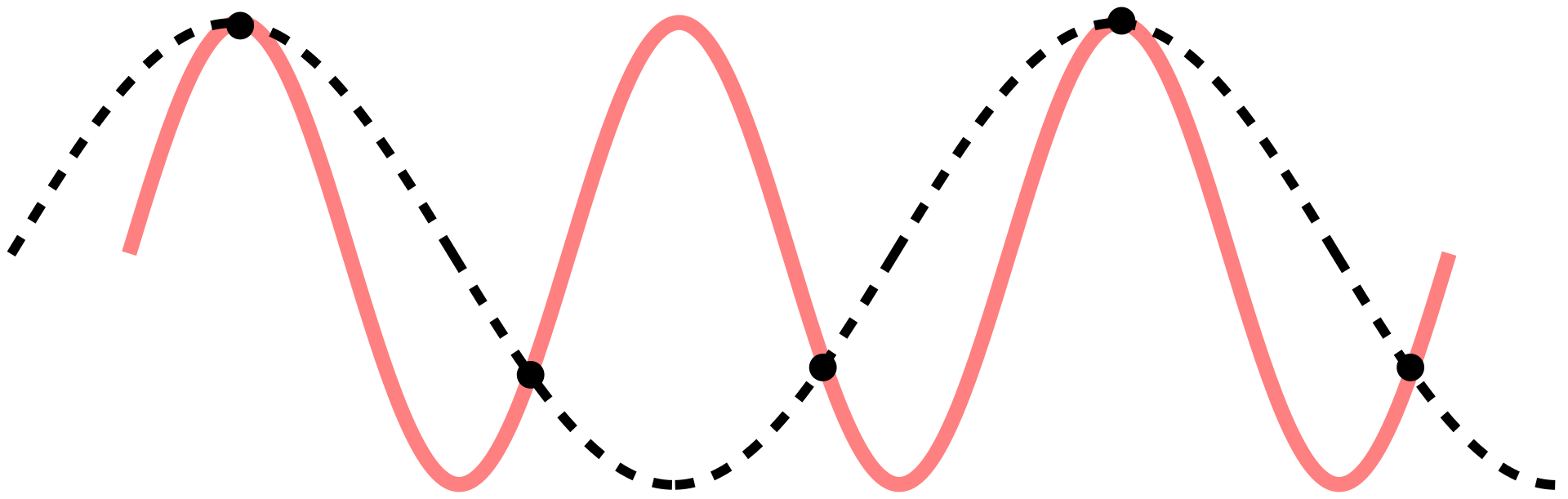 fig1. 붉은색 선이 실제 신호라고 합시다. 이때 검은 점은 sampled value입니다. 저 점들을 지나는 신호는 붉은색 실선 말고도 검은색 점선이 존재하지요. 이처럼 sampling rate가 낮으면 원래 신호가 무엇인지 알 수 없게 됩니다. 이런 신호(붉은색 실선, 검은 점선)을 Aliased pair라고 합니다. 이러한 문제 상황을 Aliasing 이라 하지요.